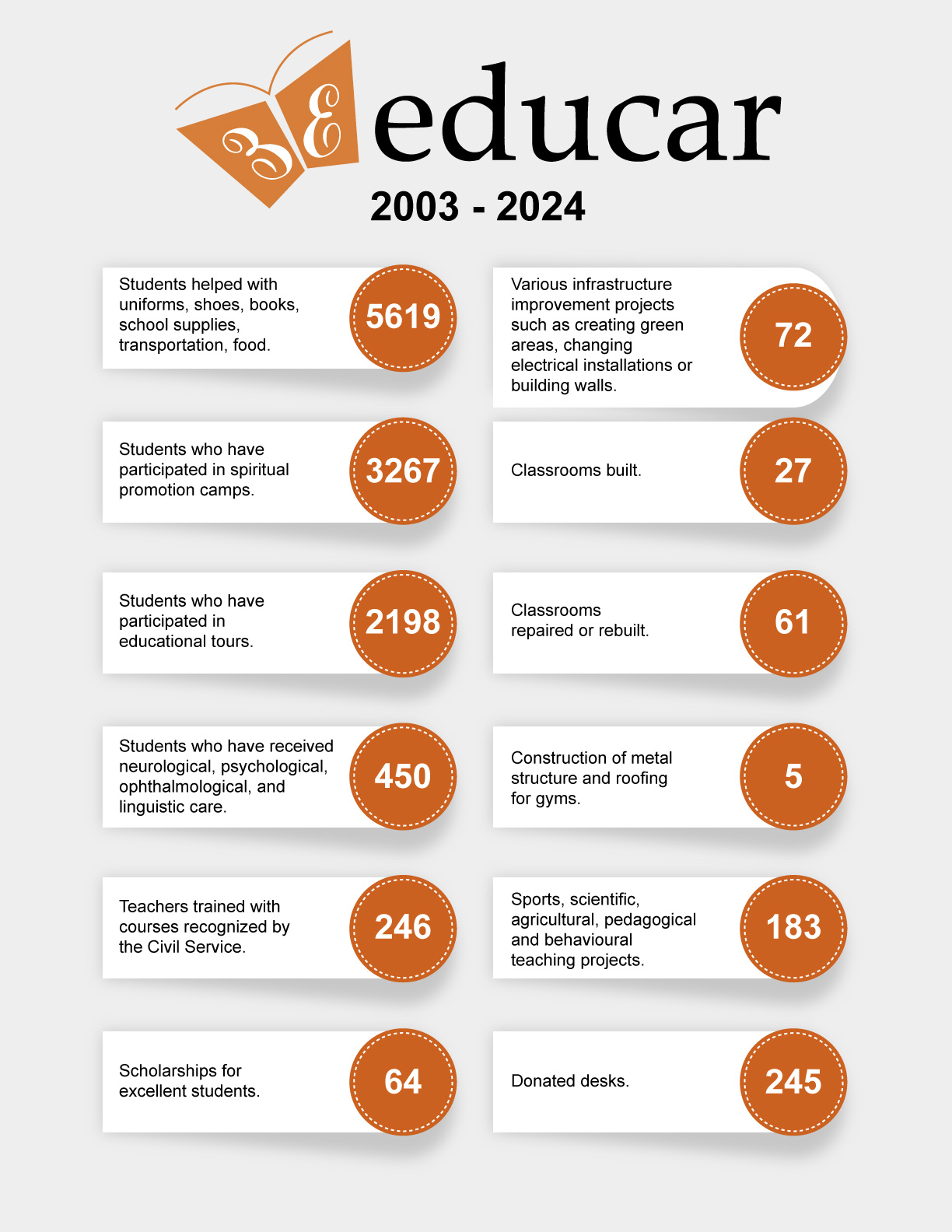 Resources have been provided to enable socially-disadvantaged students to remain in school by providing them with uniforms, shoes, transportation, meals, and school materials. In addition, we have sponsored sports, arts and academic programs developed by teachers.
